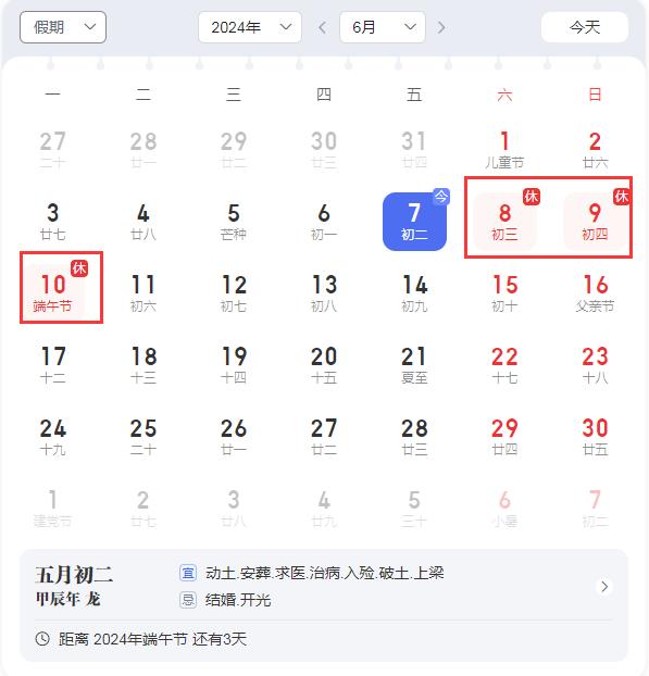 2024年端午節放假時間安排: 6月8日(星期六)至6月10日(星期一)放假調休,共三天。6月11日(星期二)上班。